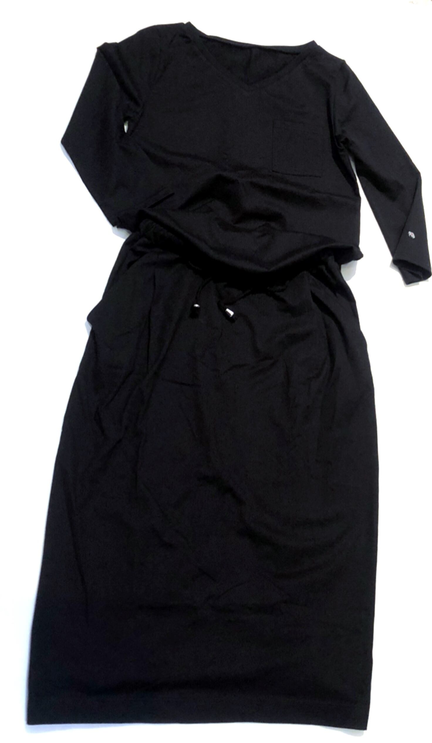 トップスは、デコルテがきれいに華奢に見える首周りのVネック、気になる二の腕から肘のラインもカバーしてくれる程良い丈感(・ω‐人)