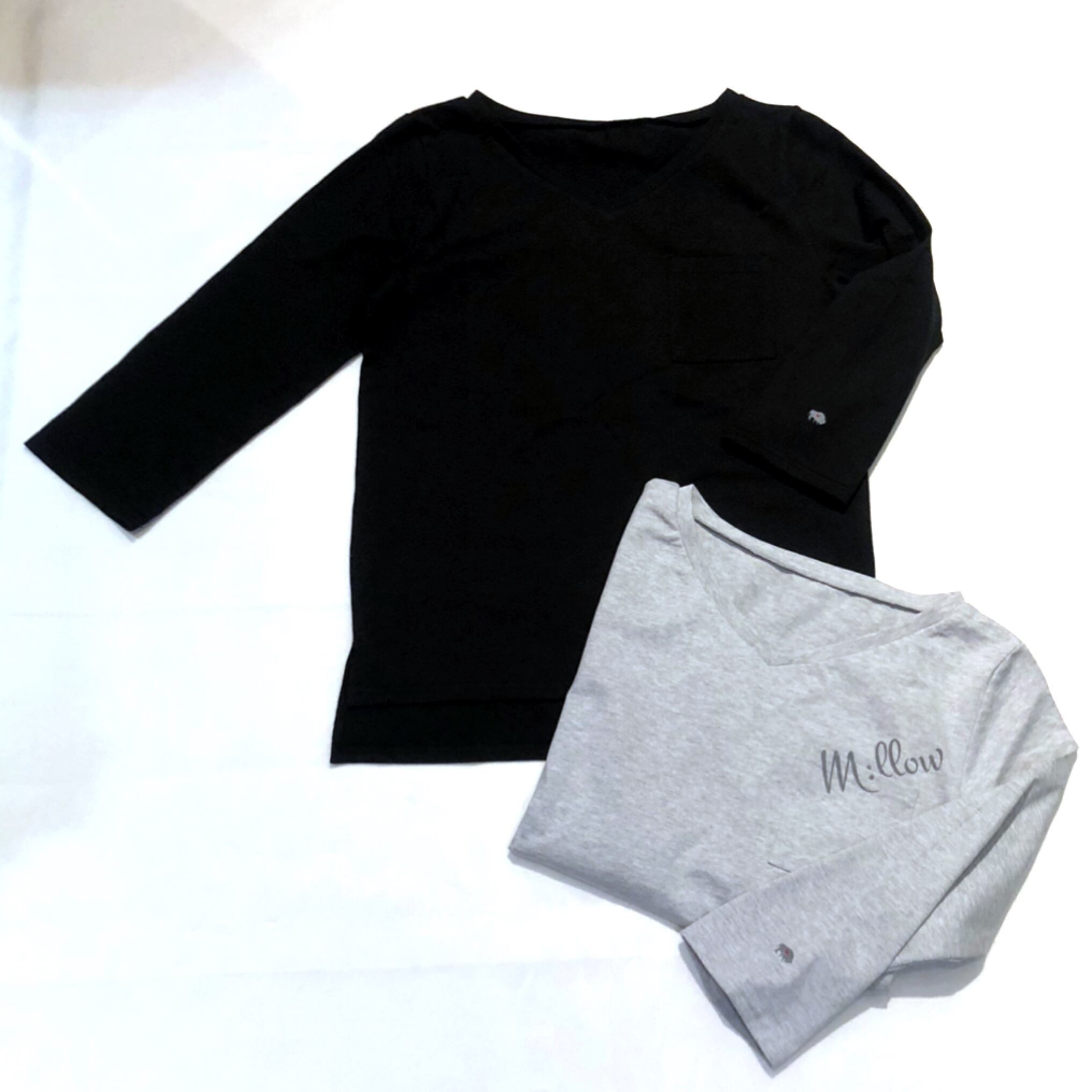 トップスは、デコルテがきれいに華奢に見える首周りのVネック、気になる二の腕から肘のラインもカバーしてくれる程良い丈感(・ω‐人)